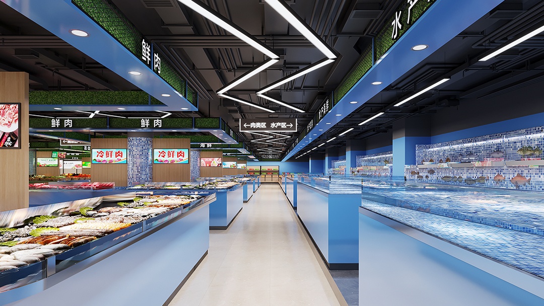 杭州生鮮超市裝修設(shè)計(jì),巧妙運(yùn)用色彩分區(qū),以藍(lán)色勾勒生鮮區(qū),綠色暈染蔬果區(qū),打造出別具一格的購(gòu)物空間。踏入生鮮區(qū),靜謐而深邃的藍(lán)色調(diào)撲面而來(lái),營(yíng)造出海洋般的清涼氛圍。冷柜、展示架皆以藍(lán)色為主,與各類(lèi)鮮活的海鮮、肉類(lèi)相互映襯,凸顯品質(zhì)與新鮮。移步蔬果區(qū),清新的綠色瞬間讓人心曠神怡。生機(jī)勃勃的綠植裝飾與翠綠的蔬果相得益彰,仿佛置身于田園之中。合理的陳列布局,讓每一顆果實(shí)、每一把蔬菜都能盡情展現(xiàn)其飽滿(mǎn)姿態(tài)。藍(lán)綠交織的設(shè)計(jì),不僅為顧客帶來(lái)視覺(jué)上的享受,更引導(dǎo)著購(gòu)物動(dòng)線(xiàn)。在這里,每一次挑選都是與自然的親密對(duì)話(huà),開(kāi)啟一場(chǎng)鮮活、健康的購(gòu)物之旅。