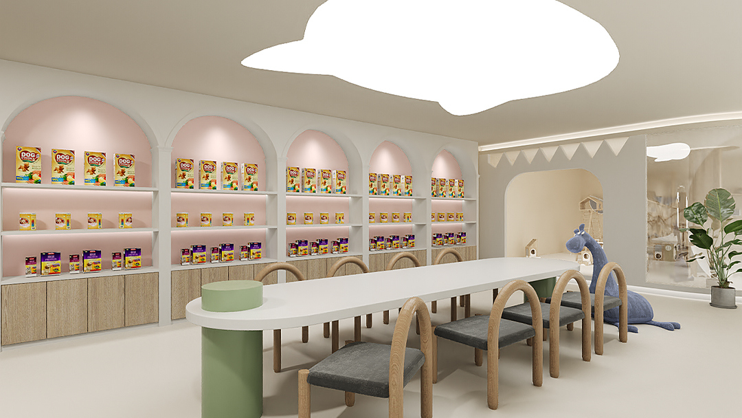 采用“模塊化隔斷+開放式布局”組合,劃分美容區、寄養艙、活體展示區及醫療操作間。例如犬類活動區鋪設防滑橡膠地板,貓柜采用雙層立體結構并嵌入隱藏式貓砂盆,提升空間利用率的同時減少寵物應激反應。 - 自然元素與治愈氛圍