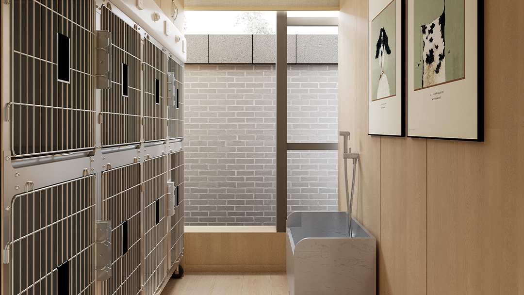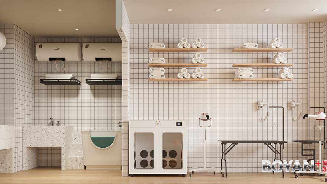 利用層高優勢構建雙層結構:一層設置活體展示區與美容SPA區,二層規劃寄養艙與休閑互動區。例如犬類活動區采用防滑玻璃地板,貓柜則設計成樹屋式攀爬架,提升空間利用率。 - 工業風與自然元素融合