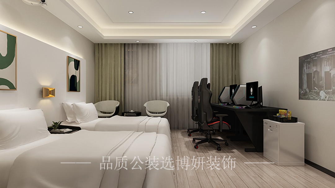 博妍裝飾深知年輕群體對于電競酒店的需求。從空間布局上,他們巧妙地將客房與電競區域融合,既保證了休息的舒適性,又營造出專業的電競氛圍。采用時尚且富有科技感的色彩搭配,如炫酷的藍色與活力的橙色碰撞,讓整個空間充滿活力。燈光設計更是一絕,可調節的智能燈光,能根據不同的使用場景切換,無論是激烈的游戲對戰還是愜意的休閑時光,都能提供恰到好處的照明。