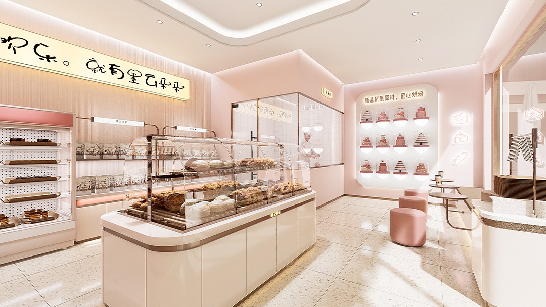 杭州網(wǎng)紅烘焙店裝修設(shè)計(jì)亮點(diǎn),本案以“甜蜜劇場(chǎng)”為概念,打造沉浸式烘焙社交空間。弧形島臺(tái)與翻糖藝術(shù)裝置形成視覺(jué)焦點(diǎn),墻面采用漸變色手工肌理漆,呼應(yīng)馬卡龍主題色彩。臨街面設(shè)計(jì)折疊全景窗,搭配外擺休閑區(qū)增強(qiáng)互動(dòng)感。重點(diǎn)打造“透明后廚長(zhǎng)廊”與“自選原料市集”,結(jié)合暖調(diào)軌道射燈與定制復(fù)古面包陳列架,在強(qiáng)化生產(chǎn)可視性與產(chǎn)品新鮮度的同時(shí),構(gòu)建高傳播性的打卡場(chǎng)景,實(shí)現(xiàn)功能與美學(xué)的雙向賦能。