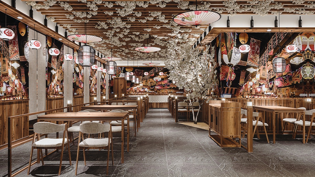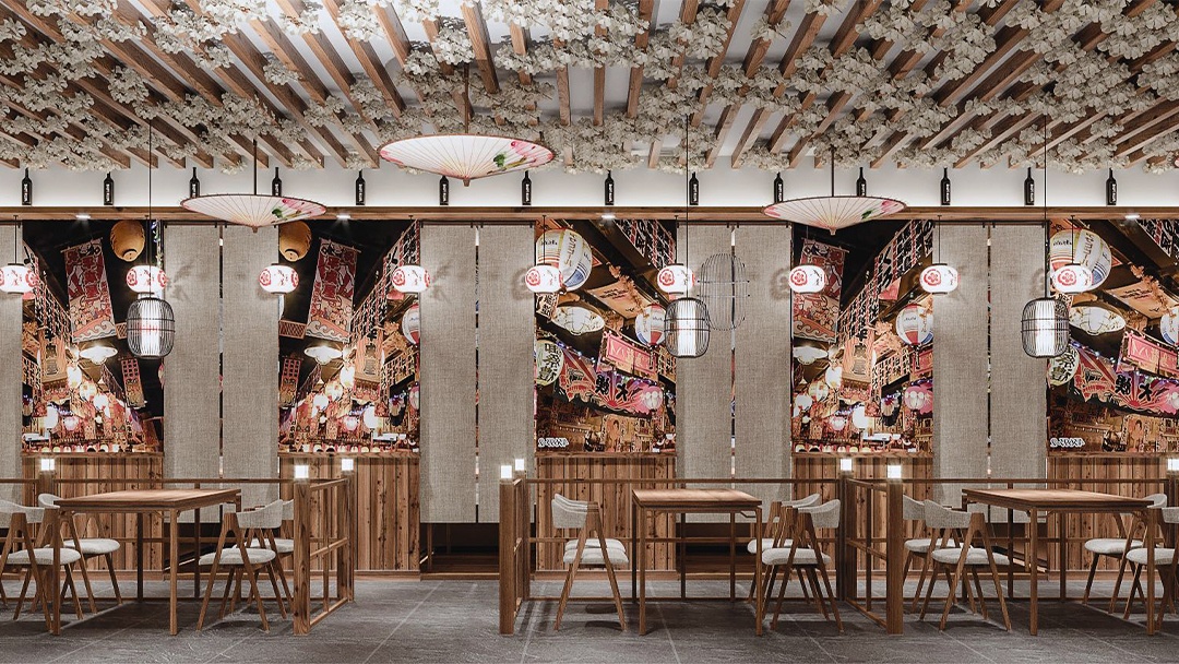 材質與氛圍:選用原木、竹編、素色涂料等天然材料,搭配暖黃燈光與庭院枯山水造景,營造靜謐雅致的用餐環境。