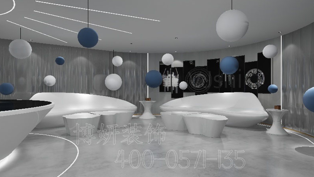 藍色,作為點綴色巧妙融入,或是在展示屏幕的邊框,或是在休息區的軟裝,為冷靜的空間增添靈動與科技感。線性燈帶,沿著墻面、天花板蜿蜒伸展,如流動的光河,不僅勾勒出空間的輪廓,更營造出未來感十足的氛圍。