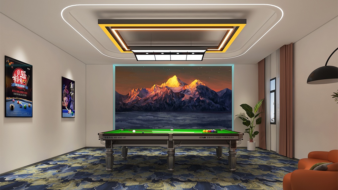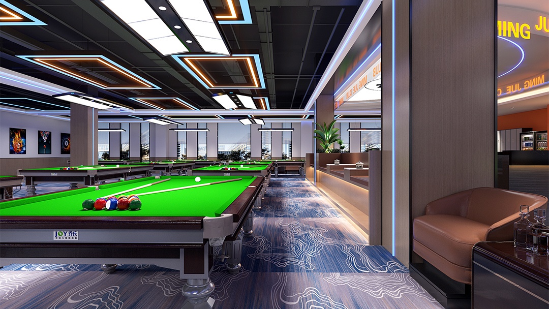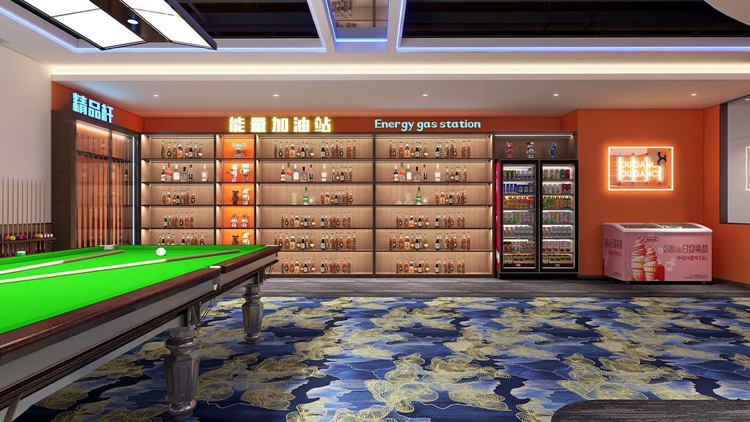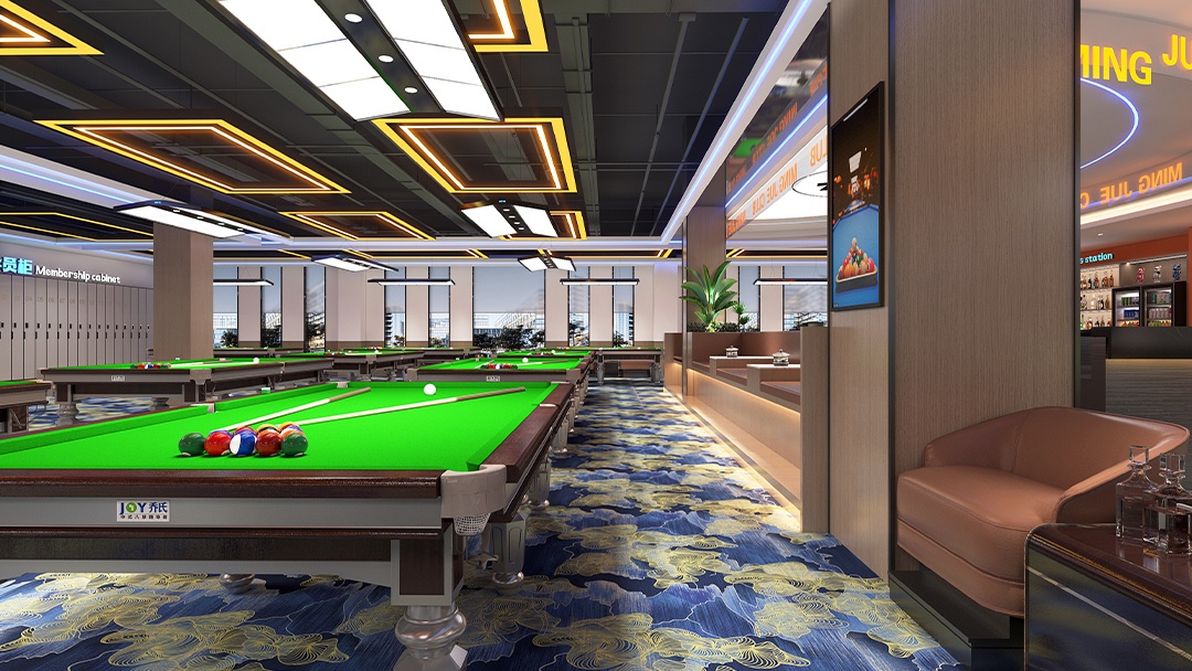 針對臺球廳的特殊性,博妍裝飾從五大維度構建核心競爭力:在空間規劃上,采用“中央集中式”或“周邊環繞式”動線設計,確保球桌間距1.5-1.8米、主通道≥1.8米,并通過鏡面/綠植隔斷劃分功能區;在燈光系統方面,配置4000K色溫LED無影燈,照度300-500勒克斯,搭配3000K暖光筒燈,既滿足擊球精準需求,又通過光影層次延長顧客停留時間;材質選擇上,地面采用短絨地毯或PVC防滑地板,墻面結合吸音板材與軟包工藝,配合礦棉板吊頂優化聲學環境;主題營造中,擅長將英倫風、賽博朋克等元素與臺球文化融合,例如設置涂鴉互動墻、賽事影像展示區,甚至嵌入電競角實現多業態聯動;智能化配套則涵蓋在線預約、自助結賬系統,以及可調節氛圍的音響設備,全面提升運營效率與用戶體驗。