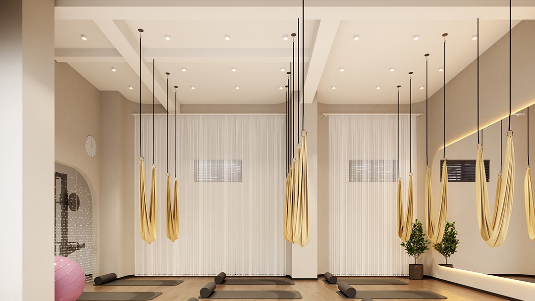 杭州輕奢風瑜伽館裝修設計,本案以「流動的靜奢」為核心理念,空間以低飽和米灰與淺香檳色為主調,弧形墻面嵌入金屬細線勾勒精致輪廓。定制透光云石接待臺與懸浮式更衣柜系統,提升輕盈質感。主練習區鋪設天然亞麻地墊,頂部懸掛漸變琉璃吊燈,可隨自然光變化呈現柔和光暈。重點打造「聲景冥想室」,采用星空頂與隱藏式環繞音響,結合植物香氛擴散系統,實現視覺、聽覺與嗅覺的多維療愈體驗。