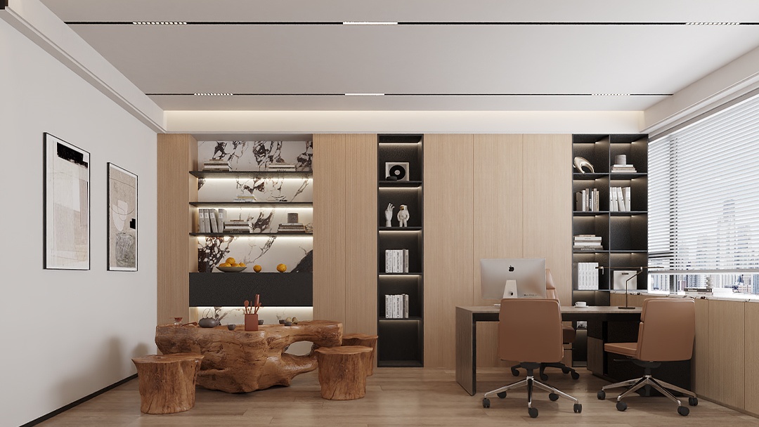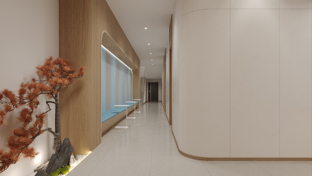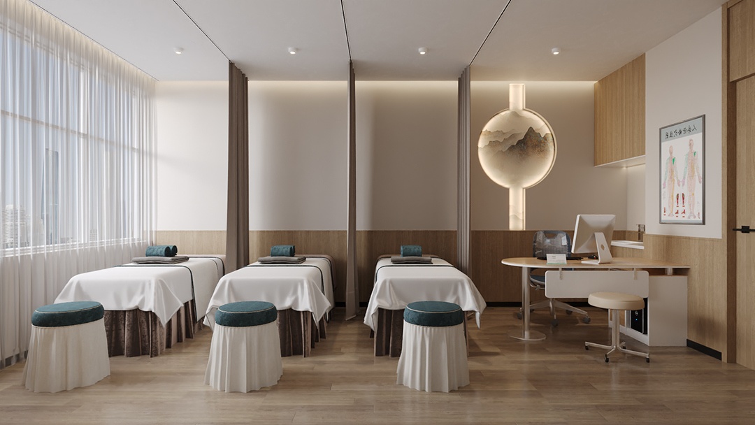 杭州新中式中醫館裝修設計,本案以“承古煥新”為理念,將江南文人精神與中醫“天人合一”哲學相融合。空間以胡桃木格柵與素色麻布為基底,藥柜區采用銅件包邊的百子柜陣列,配以隱形LED燈帶突顯藥材質感。候診區引入天井景觀,設置枯山水與藥用植物盆栽,營造靜心氛圍。診療室采用可移動宣紙屏風分隔,墻面嵌入經絡穴位發光示意圖,整體以溫潤材質與克制用色,構建既有文化認同感又符合現代診療效率的療愈空間。