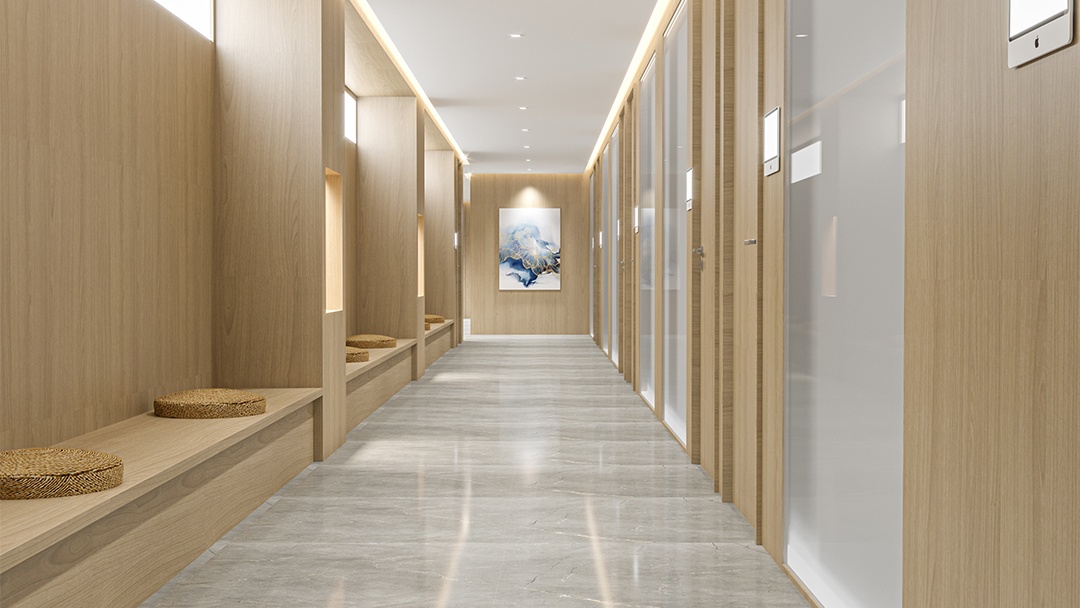 杭州宋韻文化中醫館裝修設計,深度還原宋代美學中的簡凈與意境??臻g結構取法宋式建筑的開闔韻律,采用原木榫卯框架與紙筋灰墻面,營造溫潤基底。藥柜區以青瓷色釉面磚為背板,搭配竹編藥屜與銅制稱量器具。整體以低飽和度色彩與自然光影,重構當代語境下的宋式醫藥空間體驗。